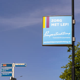 Steeds meer organisaties kiezen bewust voor langdurige aanwezigheid in de omgeving. Zo plaatste de Pompestichting lichtmastreclames met de boodschap “Zorg met lef!” langs drukke routes in Zeeland (Maashorst) en Nijmegen met onder andere vermelding van hun vacaturepagina: werkenbijpompestichting.nl. Nina van de Worp van de Pompestichting: “Ons lichtmastbord hangt in Zeeland (Noord-Brabant) – en dat blijft de komende vijf jaar zo! Met deze langdurige zichtbaarheid laten we zien dat de Pompestichting niet alleen kiest voor de korte klap, maar juist investeert in duurzame naamsbekendheid en een sterk werkgeversmerk. Iedereen die hier dagelijks langsrijdt, kan niet om onze boodschap Zorg met lef!” heen. Dit bord staat symbool voor onze ambitie om forensische psychiatrie én het werken bij de Pompestichting blijvend op de kaart te zetten.”